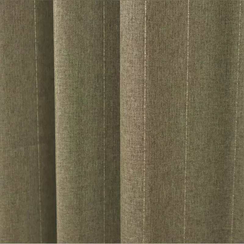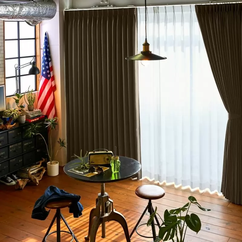 落ち着いた色味をベースにしながら、絶妙なミックス感がある色で、きらりと光る縦のラインとあいまって、上質さを感じさせるカーテンです。オトナカジュアルなインテリアに是非お選びください。