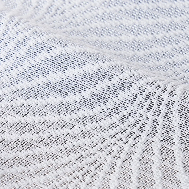 ミラー・UVカット機能付きのレースカーテンです。細かいダイヤが連なった独特の柄でタテのストライプが表現されたレースです。縦のラインの一部にきらりと光るラメ糸が使用されています。