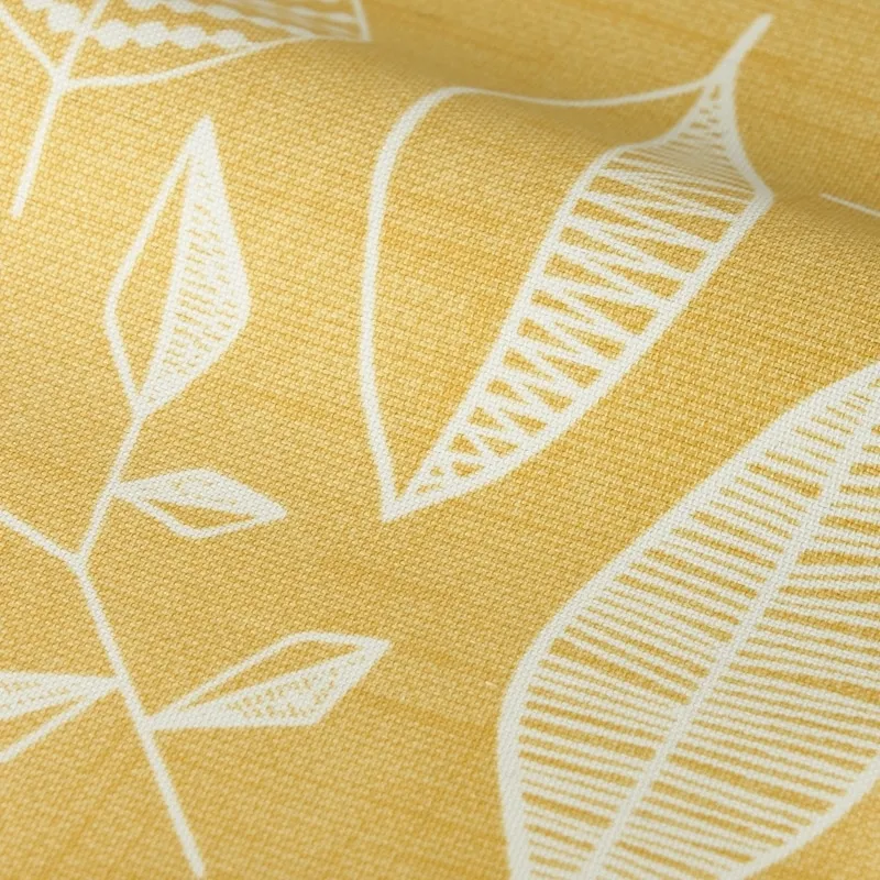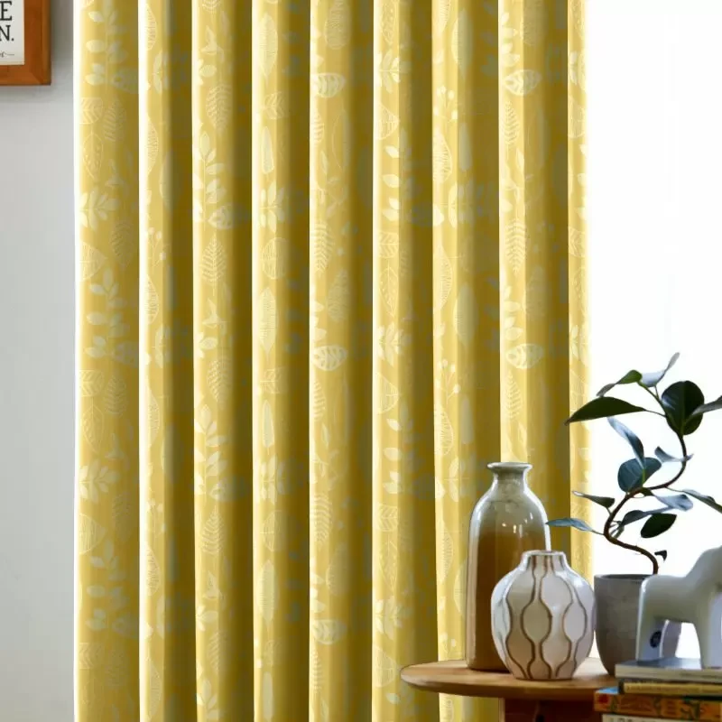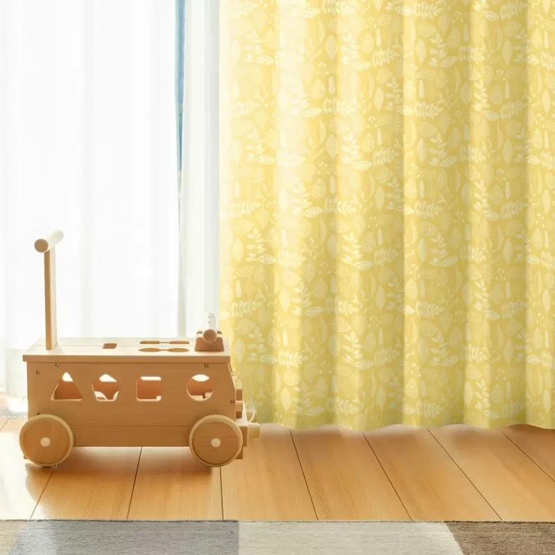 手描きスケッチ風に様々な形の葉っぱを描いた、カジュアルで北欧ライクな印象の遮光2級プリントドレープです。ナチュラルモダン・北欧テイストのインテリアがお好みの方に特におすすめ。家庭洗濯OK(ウォッシャブル)なのでお手入れも簡単です。カラー:あざやかなイエロー色