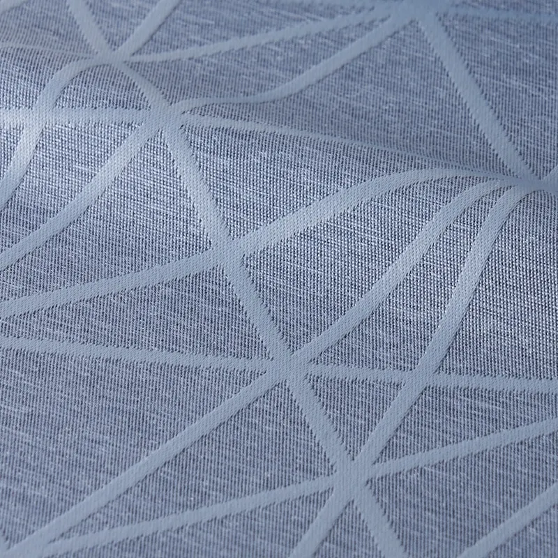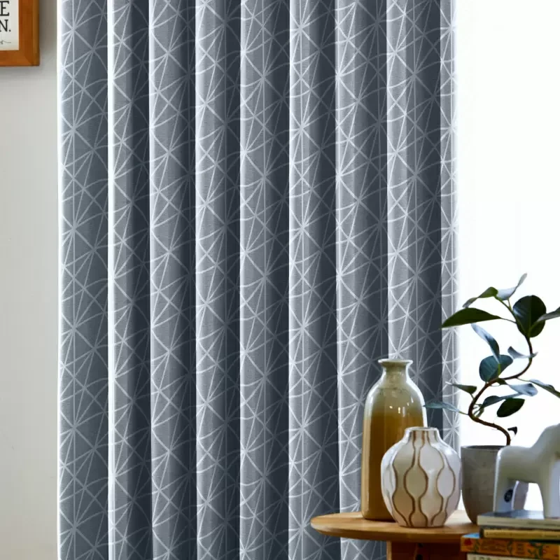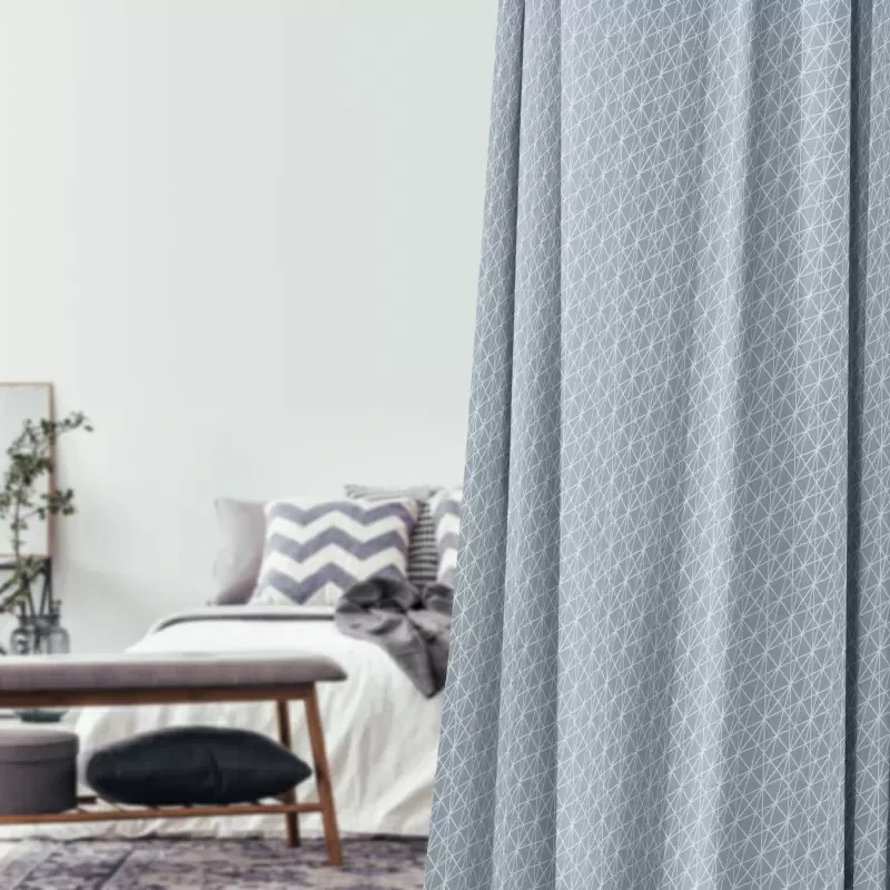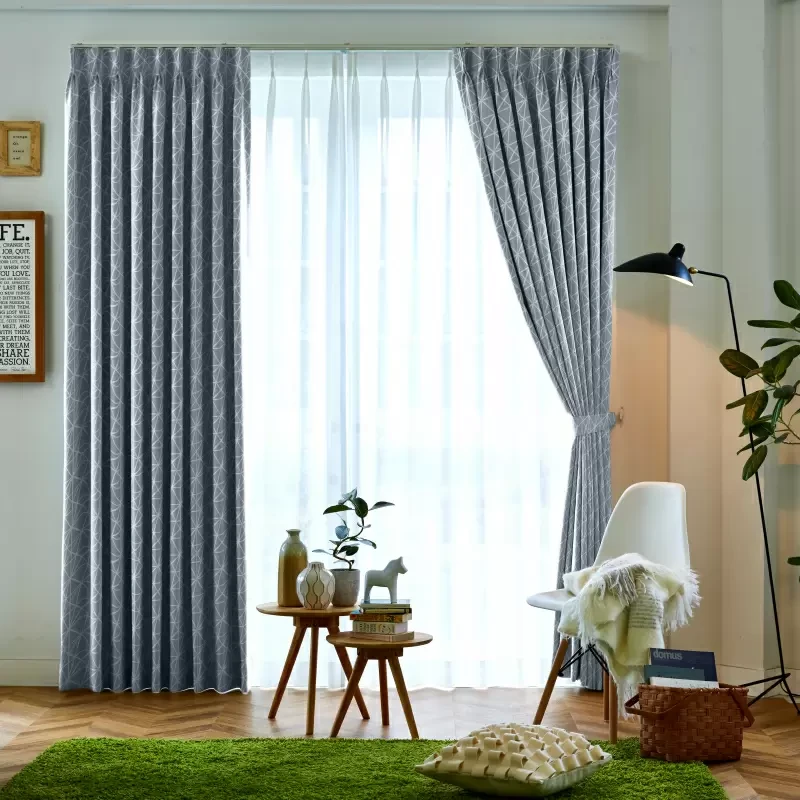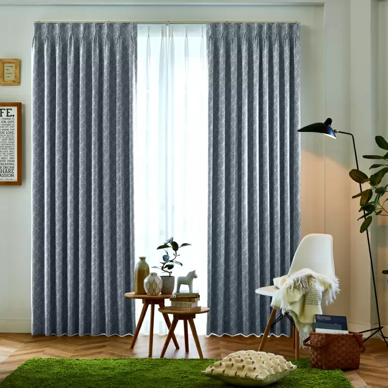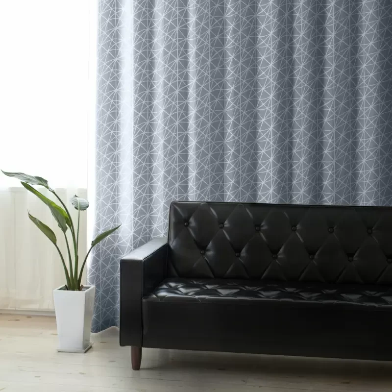 レーザービームを交差させたような、シャープでスタイリッシュな幾何紋様が美しい、小紋柄シリーズ遮光ドレープです。織り?染めまでの工程をすべて日本国内で行っており、品質は折り紙付きです。