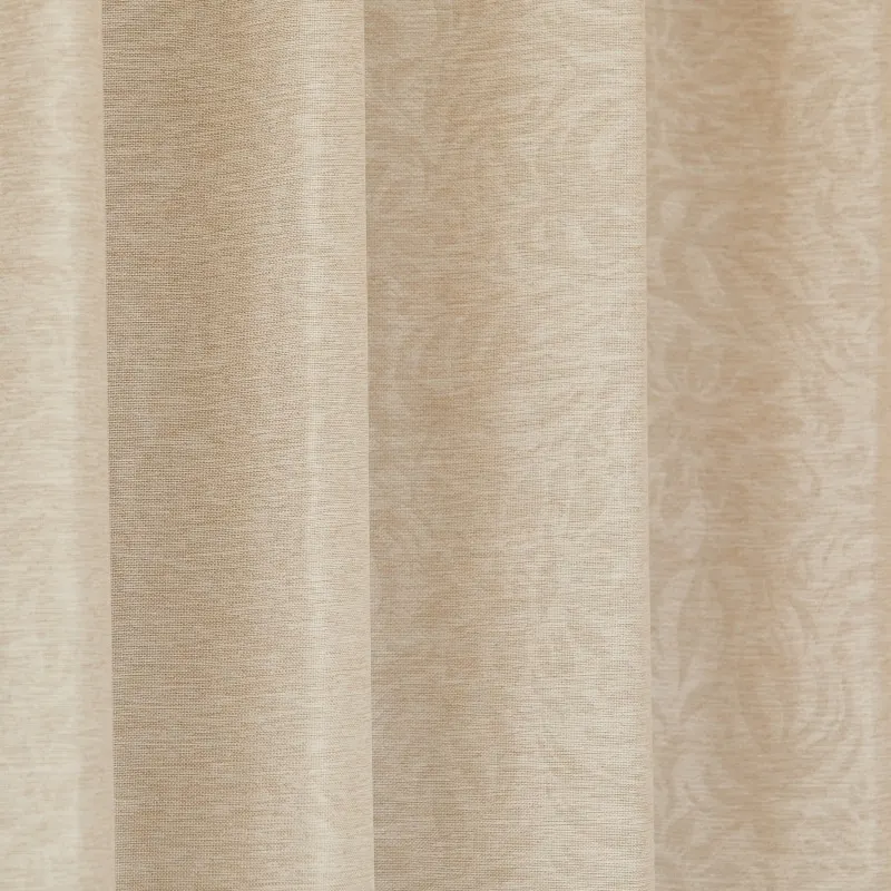 無地調ながらも、光と見る角度によってエンボス加工(型押し)によるエレガントなボタニカル柄が浮かび上がる、遮光2級のドレープカーテンです。上品な光沢もあり、高級感のあるおすすめ生地のです。エレガンスだけでなく、クラシック、モダンテイストの家具にもコーディネートしやすく、リビングや寝室にもよく合います。家庭洗濯OK(ウォッシャブル)なのでお手入れも簡単。同柄のレースカーテンもあります。カラー:ナチュラルなアイボリー色